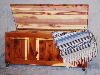 This chest was made with solid aromatic cedar. It features raised panel construction with antique brass hardware. The outside is finished with gloss polyurethane and the inside is left unfinished to allow the aroma of the wood to permeate and protect stored linens and clothing. |