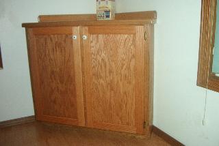 This cabinet was made in the style to match the existing cabinetry. It is of red oak with cove and coped door frames and solid wood edge banding under the top. It certainly looks as if it was part of the original construction of the home. |
