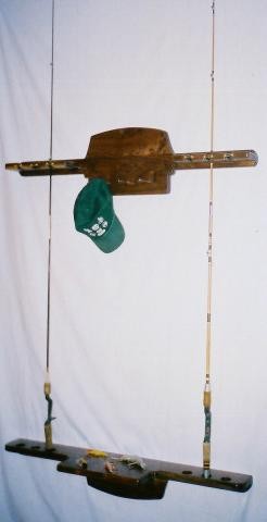 The grain of this solid air-dried walnut has an iridescent quality not found in kiln-dried and steamed lumber from a regular hardwood supplier. The upper rack features shaker pegs for hanging displays and the lower shelf can be used to display lures or reels. This custom piece was designed for showcasing the owner's collection of antique fishing rods. |