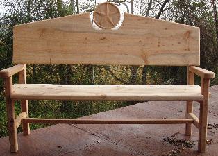 This bench was inspired by the antique original at the Bahia Mission in Goliad Texas. The frame is of white oak and the seat and back are of bald cypress. The medalion is hand-carved and set into the back with mortise and tenon joinery. All the joinery in the frame is full through mortise and tenon in the traditional mission style. |
