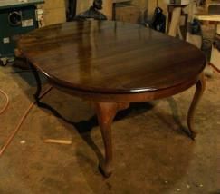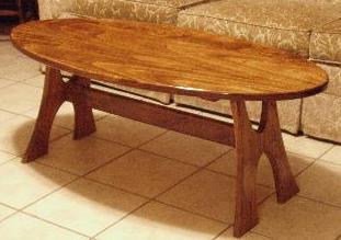 The client who requested this piece has small grand children and wanted a table without sharp edges, thus the oval shape. The aspect ratio of the ovals were repeated in the legs for a nice balance. The wood came from an ash tree that I removed from the client's yard and air dried for a year before I could fabricate the table. The finish is polyurethane over walnut stain. |